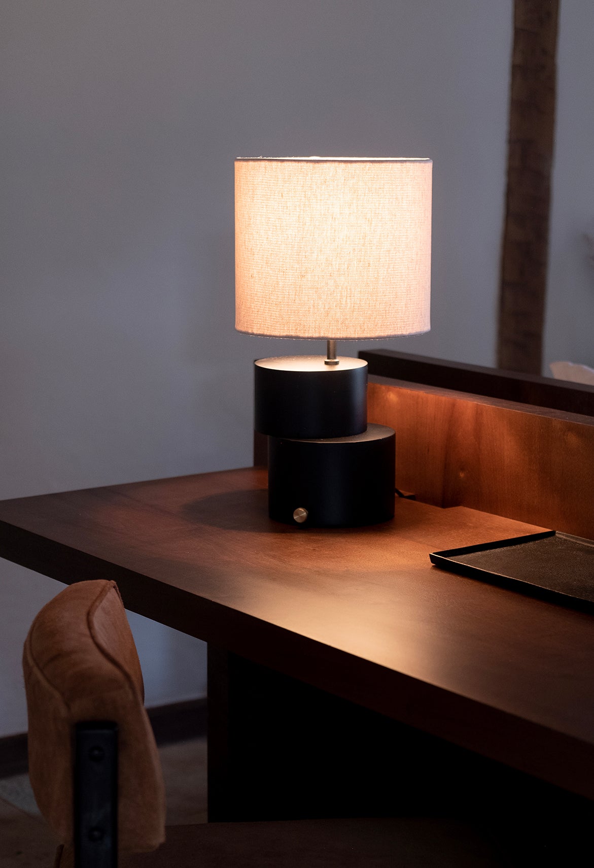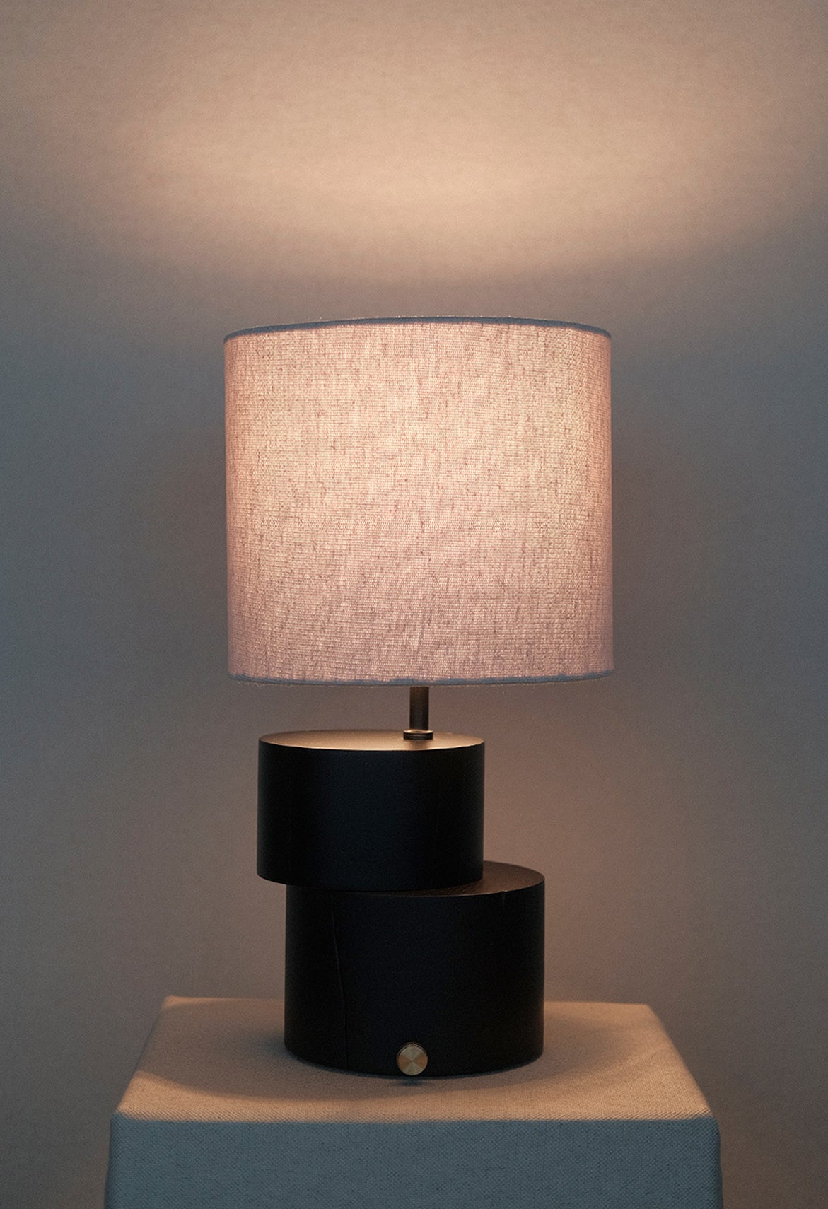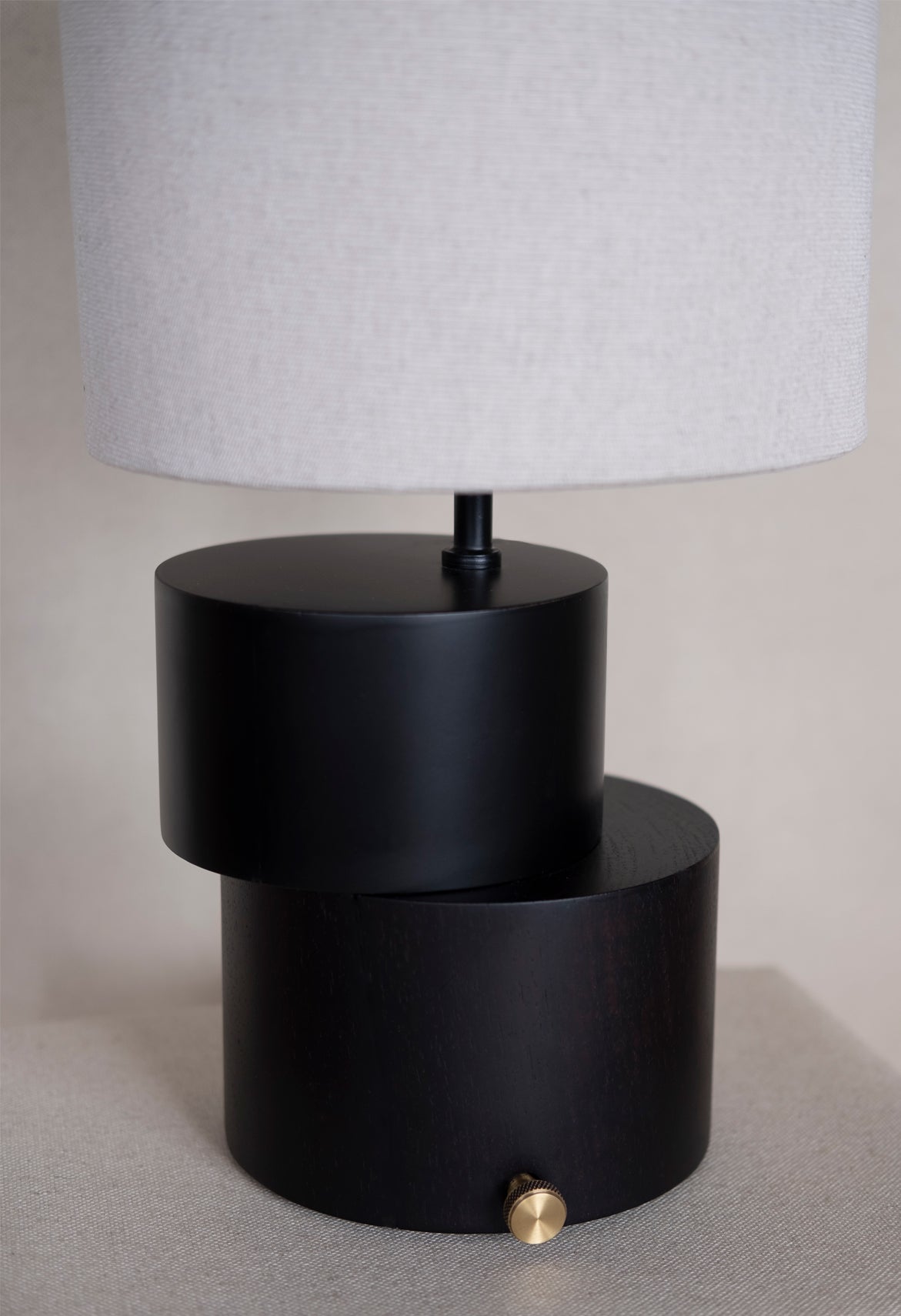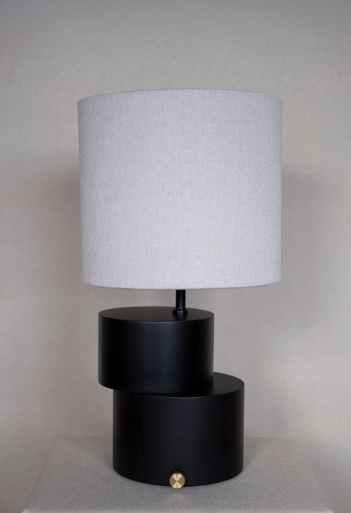 Abajur Torno, desenvolvido manualmente em madeira de demolição, cúpula de linho e acionamento em latão.